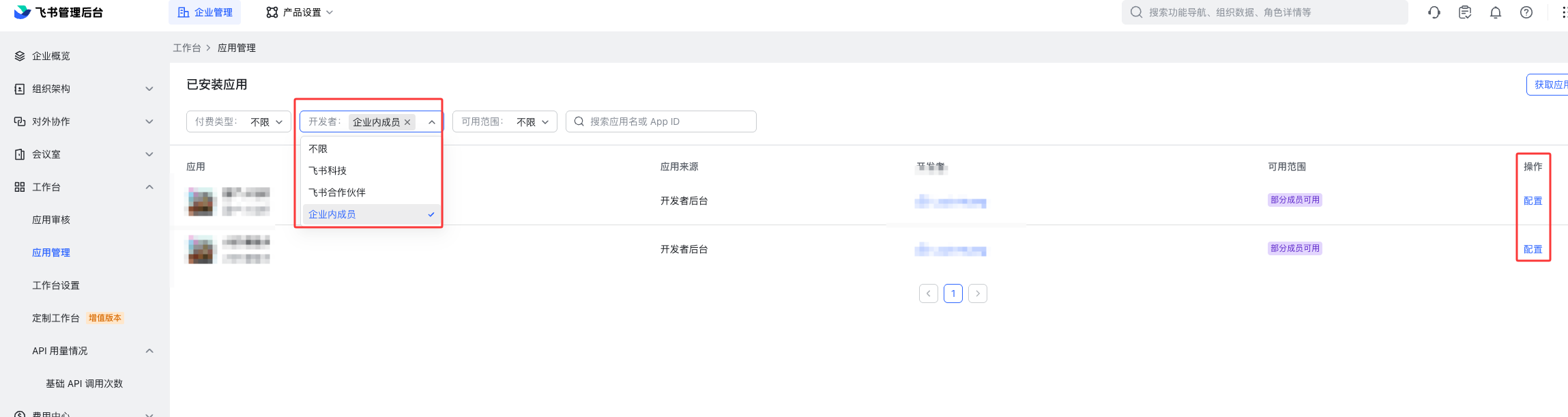 选择对应的应用,点击操作列的【配置】按钮,进入应用配置页面